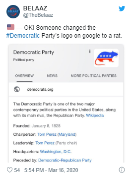 Some pranksters did not leave the chance of taking advantage of the opportunity provided to them by Democratic Party to alter the Democrat logo on Monday on the Google’s results page for the Democratic Party to a rat from the traditional donkey.