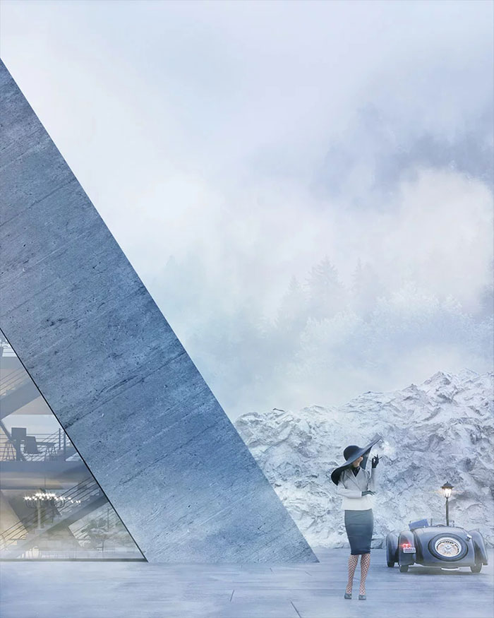 The third house is rhombhouse. The design is a huge diamond-shaped structure, it’s glazing element allows seeing through the whole building.