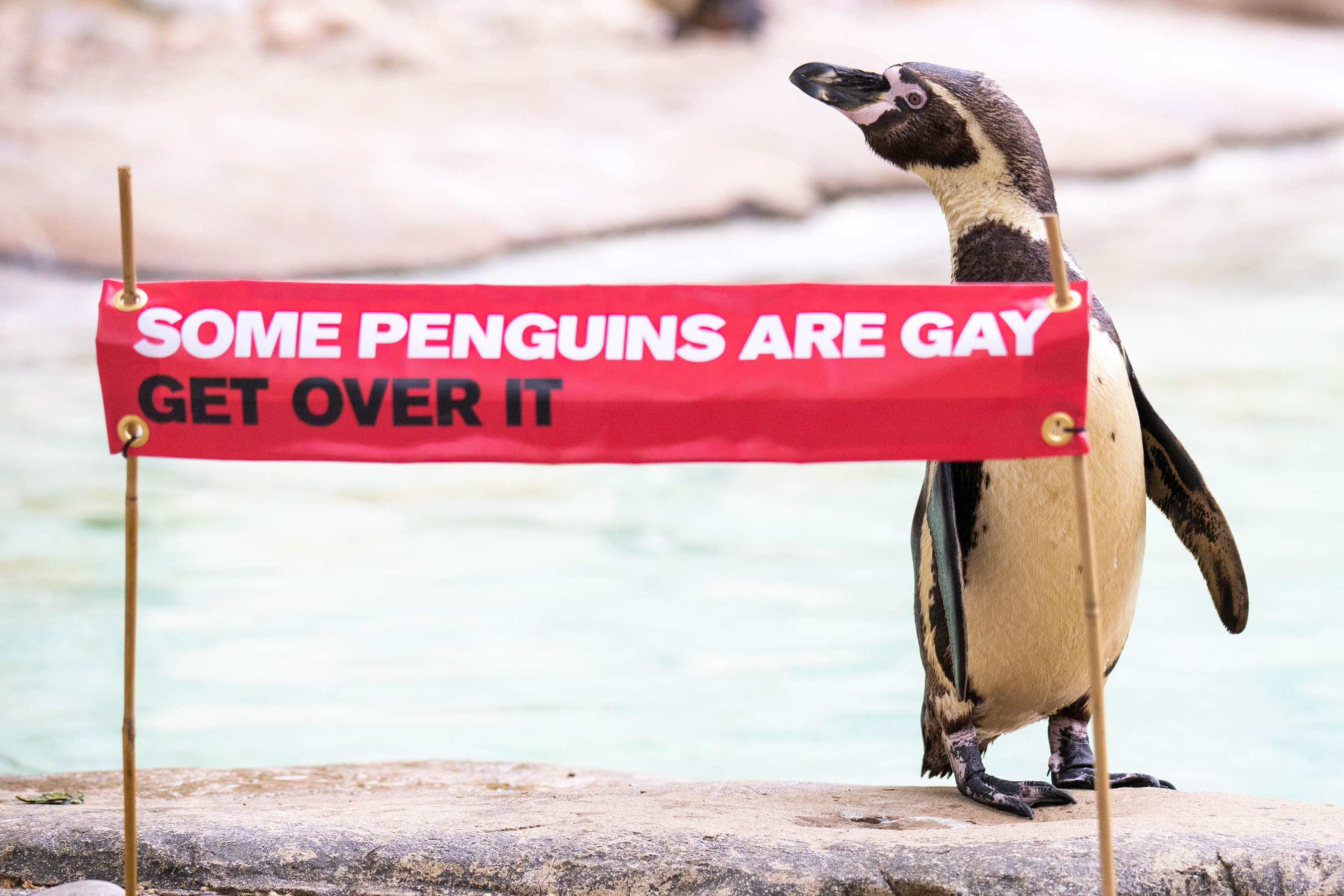 As part of the celebration, the zoo installed a banner that read “Some Penguins Are Gay, Get Over it.”