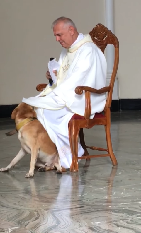 The video has gone viral on the social media networks, and people are loving how patient and calm the priest was with the loving creature.