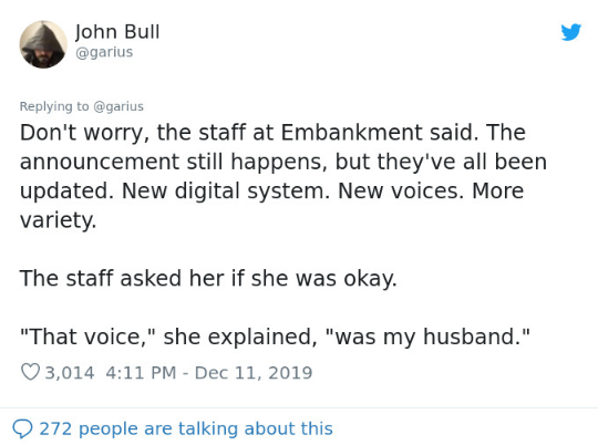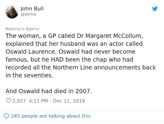 His voice was used to tell the passengers to mind the gap ahead and it was soothing for her to listen to it.