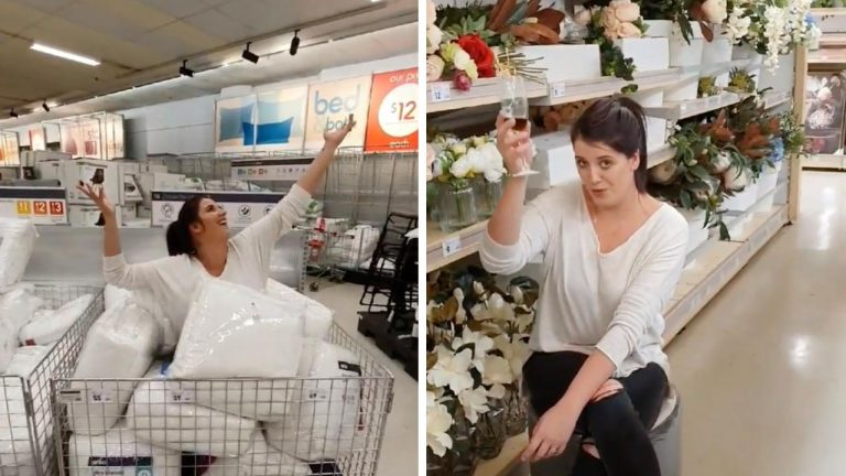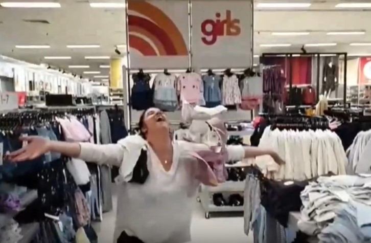 This video shows how Ellie joyfully visited the store, throwing clothes up into the air, jumping out of a pile of pillows and even wildly enjoying “wine” next to an aisle full of fake flowers.