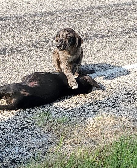 A loyal pooch was found watching over his dog friend’s body after she got hit by a vehicle on a road and succumbed to her injuries.