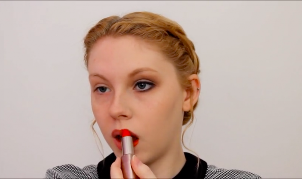 She applies all the products she wants and to top it off and add a little color, she applies the elegant and bold red lips.