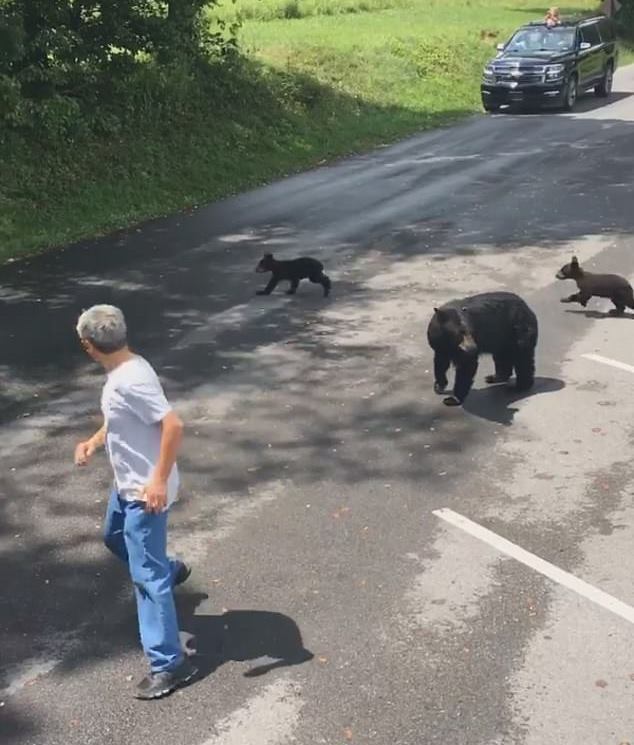 In the footage of the incident, which occurred in the Tennessee national park, the unidentified man is seen approaching mama bear and her cubs at a dangerous distance.