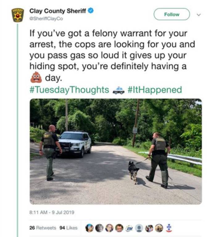 The Clay County Sheriff’s Office wrote on Facebook: “’If you’ve got a felony warrant for your arrest, the cops are looking for you and you pass gas so loud it gives up your hiding spot, you’re definitely having a [poop emoji] day ‘#ItHappened.”
