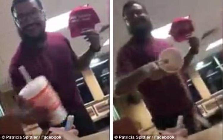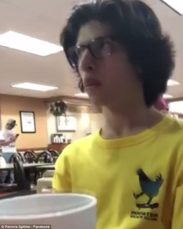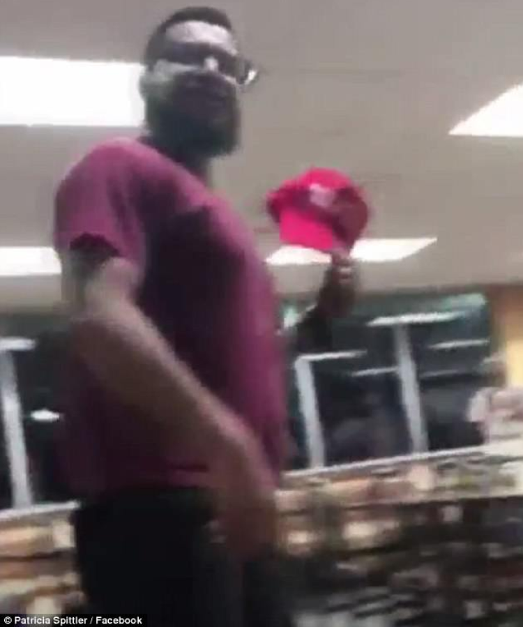 ‘Please help ID this “Scum BAG of the Year”! His friend was wearing a Patriotic Hat and this happened! It would be nice to know who he is for someone to let him know his actions are not ok! Real tough guy… approaches a group of teenagers minding their own business just having a burger! He kept his hat too! Scum bag!’ she wrote with the video.