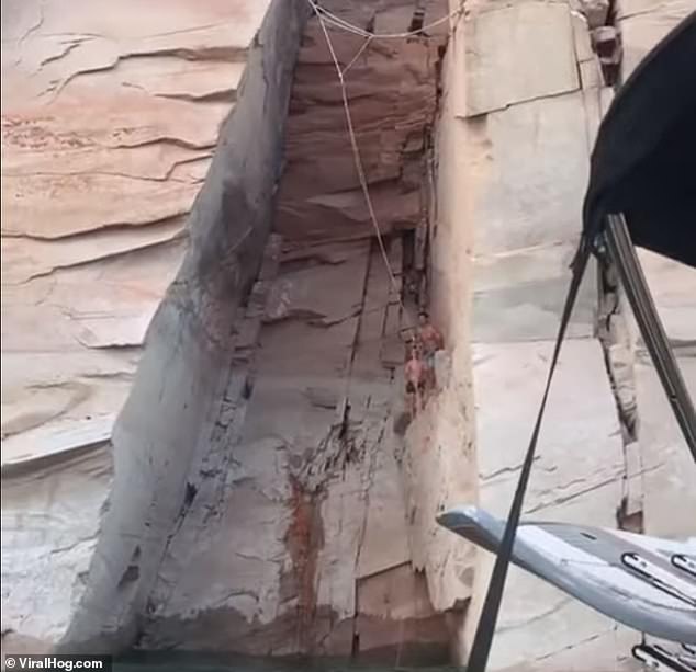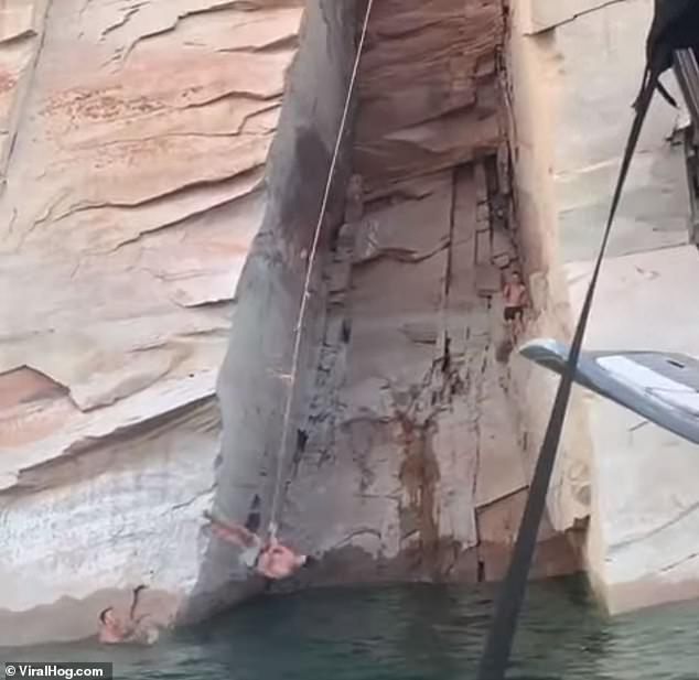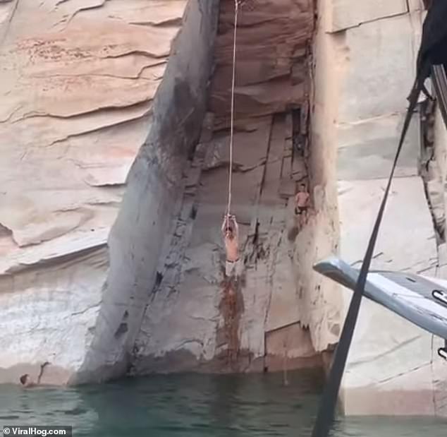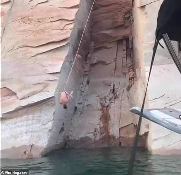 The man, who is identified as Marshall, tried to do a backflip from a small cliff while swinging from a rope at Lake Powell, Arizona but he got tangled upside down.
