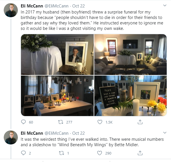 Eli McCann shared the moment his boyfriend celebrated his 33rd birthday by gathering all their friends for a funeral where they pretended that he was already dead.