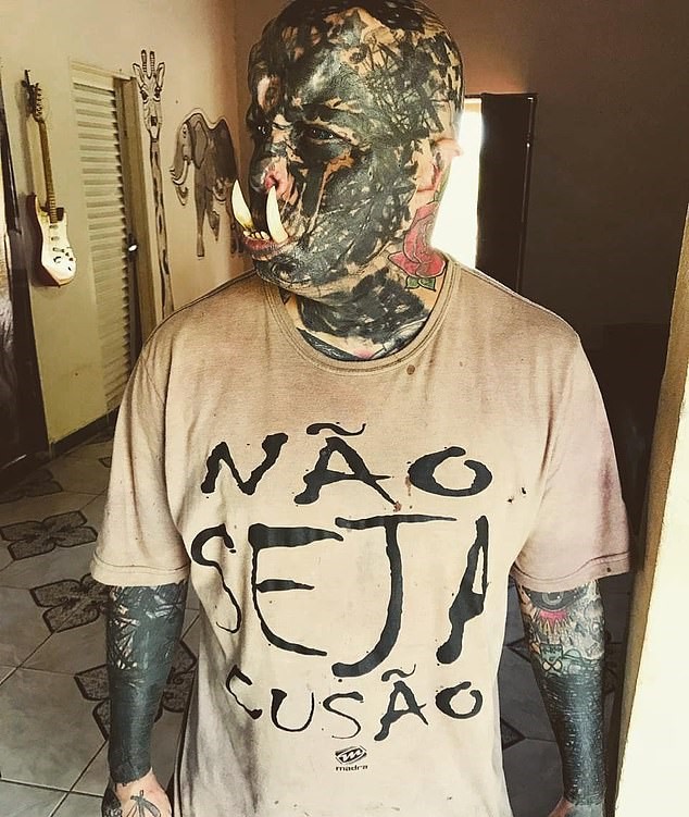 The 41-year-old has had tusks fitted to finish his ‘monster’ look after undergoing painful body modifications and covering 80 percent of his body with tattoos.