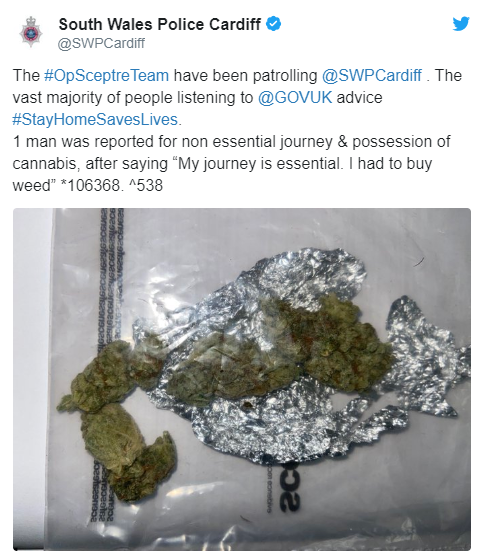 “1 man was reported for non essential journey and possession of cannabis, after saying, ‘My journey is essential. I had to buy weed.’”