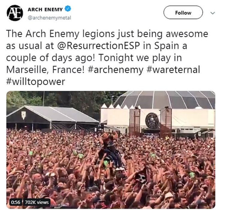 The band tweeted: “The Arch Enemy legions just being awesome as usual at @ResurrectionESP in Spain a couple of days ago.”