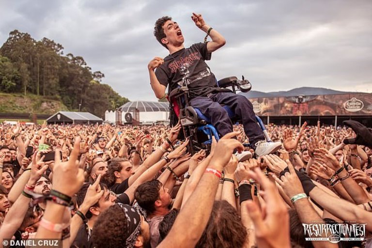 A rock fan with cerebral palsy flew high as other music lovers lifted him in his wheelchair at the Resurrection Fest in Spain.
