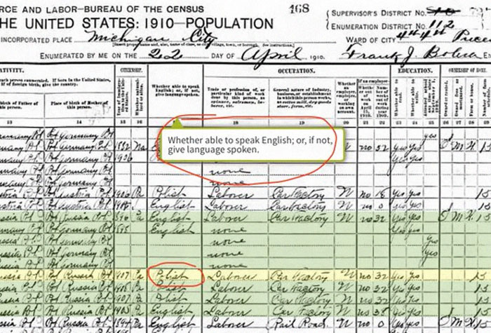CleverTitleTK tweeted: “So yeah. About that learning English thing. This is the mythologizing/selective amnesia I’m talking about. This particular Polish great-grandfather of his is shown as not speaking English in both 1910 and 1920. He arrived in 1906.”