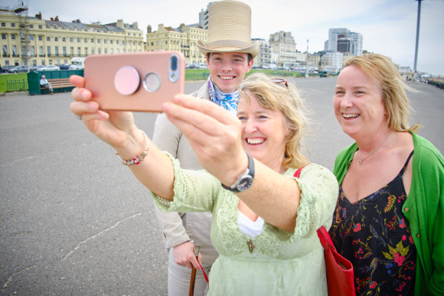 On a typical day, he will wear a riding jacket with long tails, a floral waistcoat, and knee-high riding leather boots. In addition, he is known to go out shopping in Brighton with a cane and top hat.
