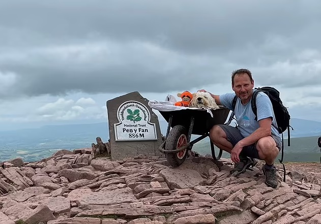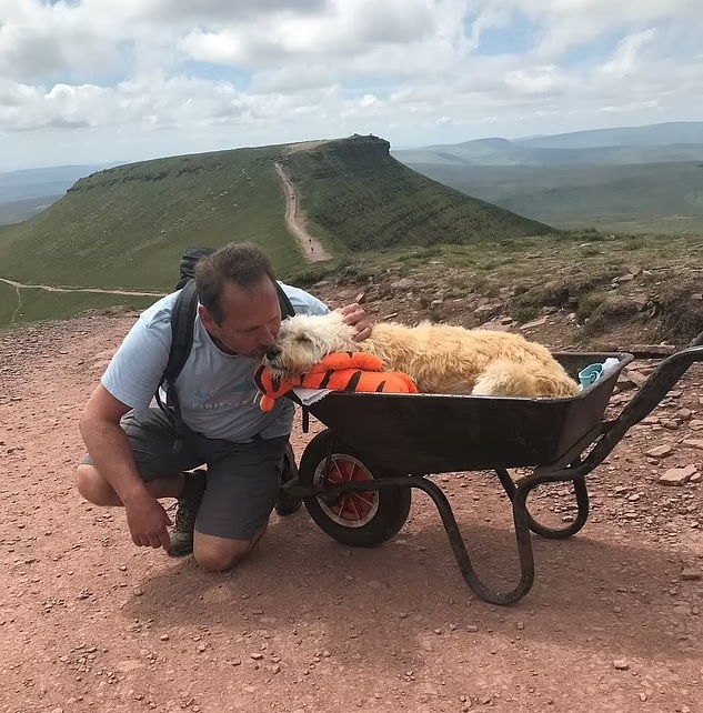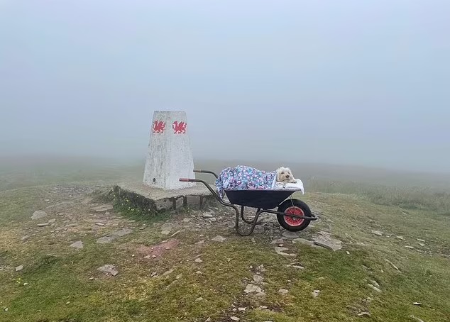 And so, Carlos loaded Monty into a wheelbarrow and pushed him all the way to the top of the mountain. He also made sure the pooch was feeling comfortable during the trip by wrapping him in warm blankets and bringing his favorite toy on the trip.