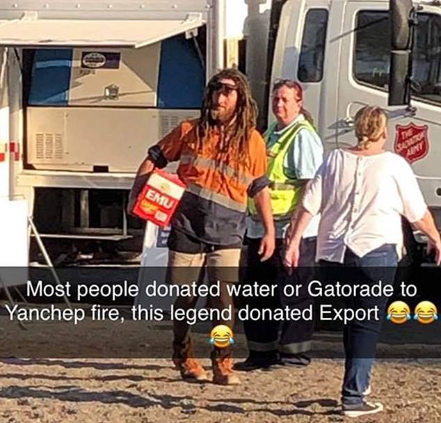 The picture was posted with the caption: ‘Most people donated water or Gatorade to the Yanchep fire, this legend donated Export.’