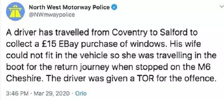 The North West Motorway Police tweeted: “A driver has traveled from Coventry to Salford to collect a £15 eBay purchase of windows.