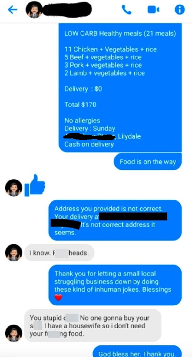 “You stupid c***. No one gonna buy your s**t. I have a housewife so I don’t need your f***ing food,” he wrote back in a text.