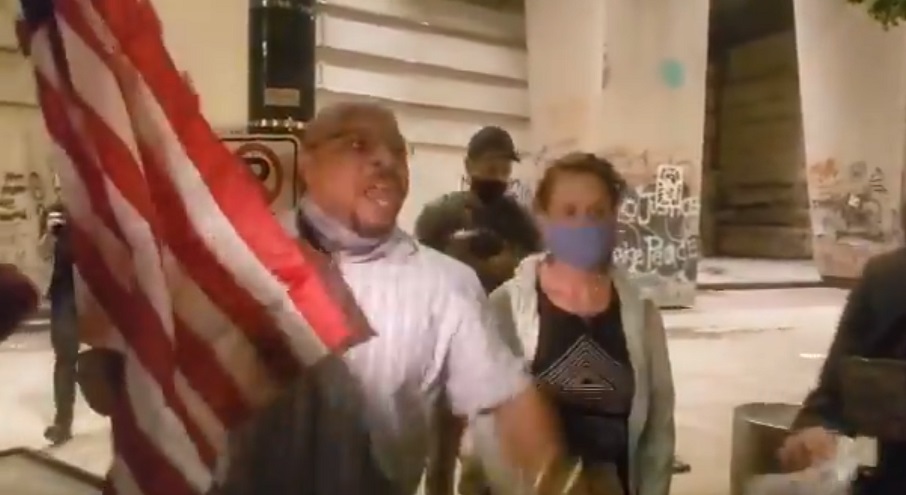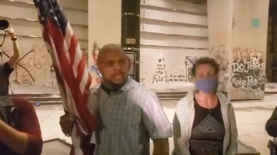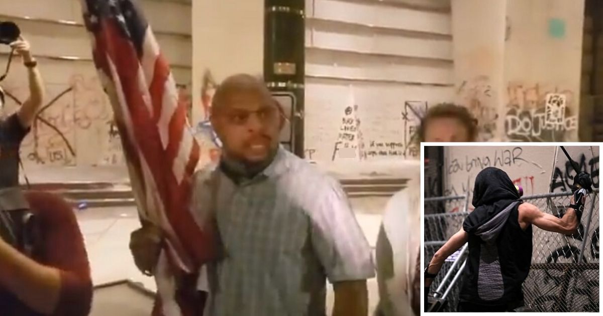 The confrontation occurred outside the Federal Courthouse in Portland where an unidentified man equipped with an American flag yelled at protesters who were trying to rip down the fence.