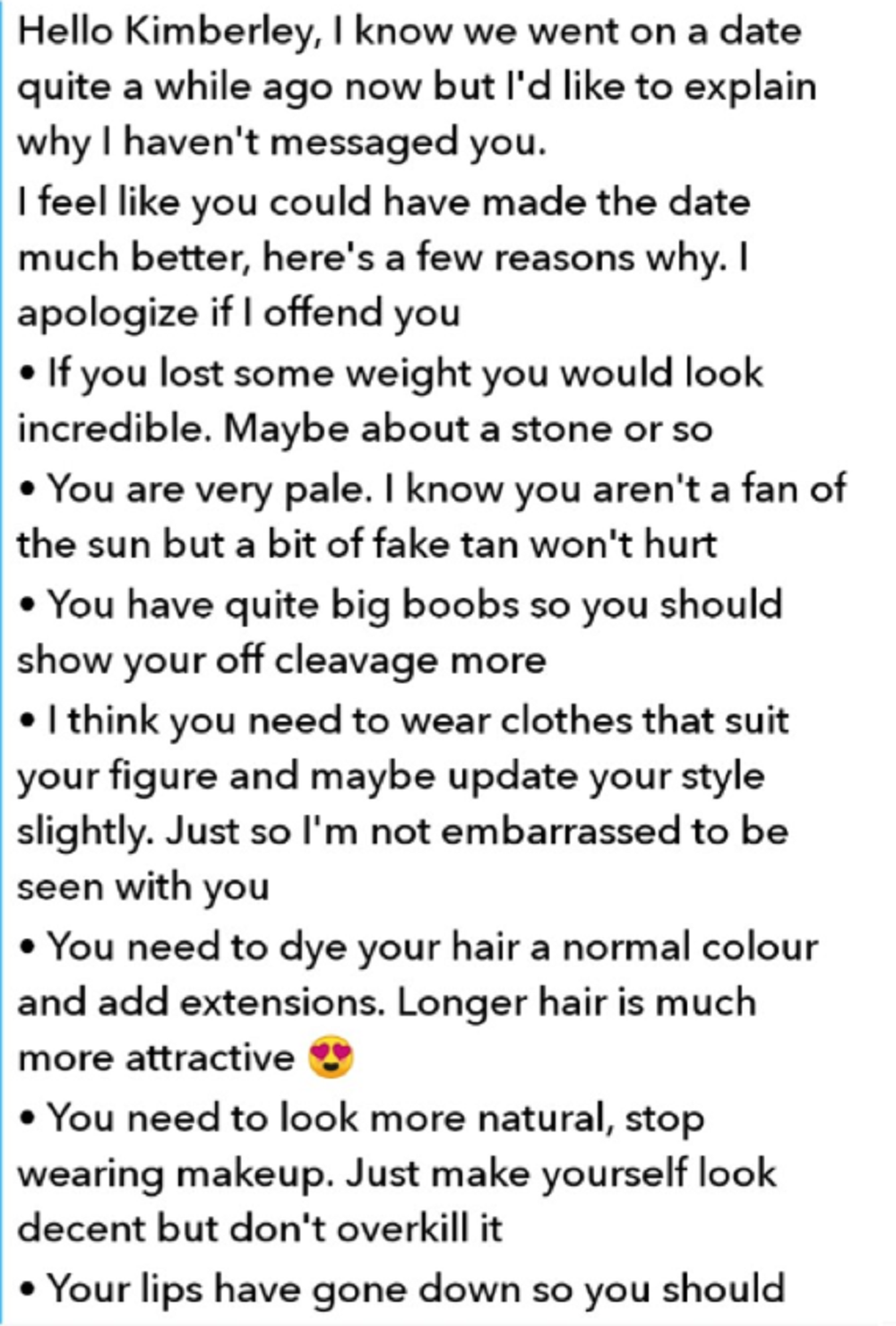 “Hello Kimberley, I know we went on a date quite a while ago now but I’d like to explain why I haven’t messaged you. I feel like you could have made the date much better, here are a few reasons why. I apologize if I offend you.