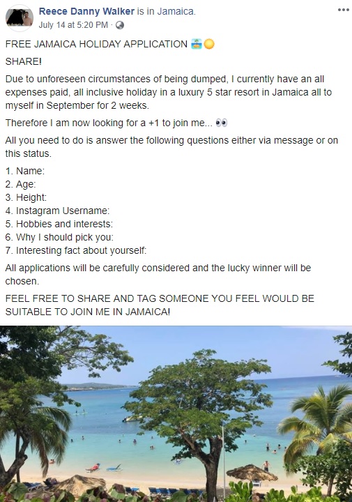 “Due to unforeseen circumstances of being dumped, I currently have an all-expenses-paid, all-inclusive holiday in a luxury 5-star resort in Jamaica all to myself in September for 2 weeks,” Reece wrote on Facebook.