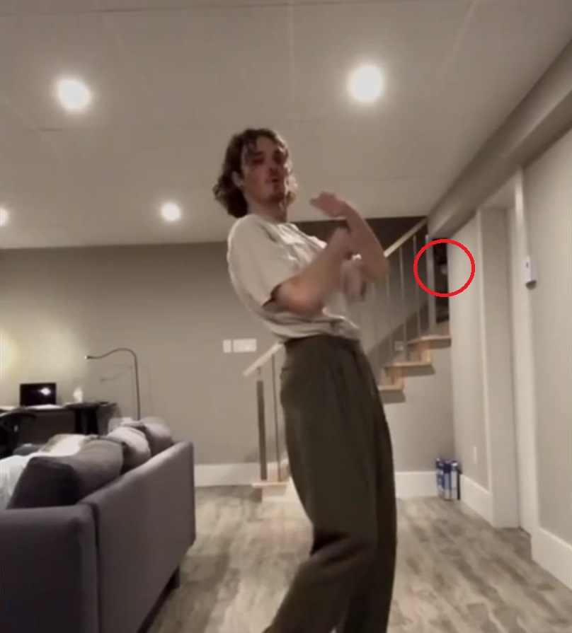 At one moment, a head is seen poking out from the shadow at the top of the staircase located behind the young man. After briefly peering at the TikToker, the head retracts behind the wall and disappears into the darkness.