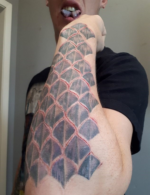 Burns had scarification done in 2017. The procedure involved using a scalpel to cut out parts of his skin to create a scale design.