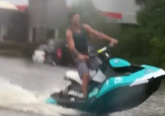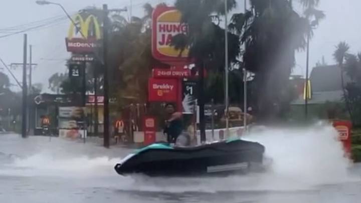 An Australian man has been recorded jet skiing down the main road and past a branch of McDonald’s following flash floods.