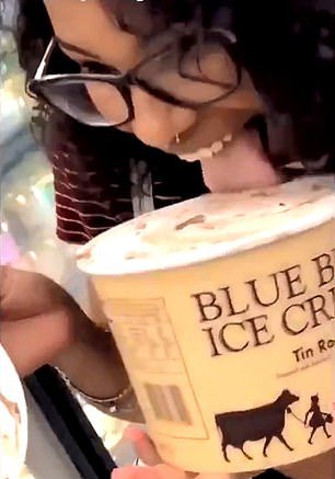 In the short footage, the woman is seen smiling from ear to ear while licking the top of the ice cream in a tub. She then puts the lid back on and places the container inside the freezer for the next customer to pick.