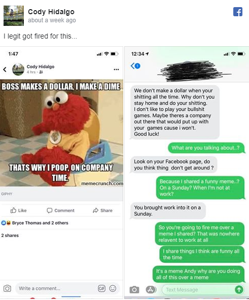 Cody then asked his boss if he was really getting fired for sharing a meme.