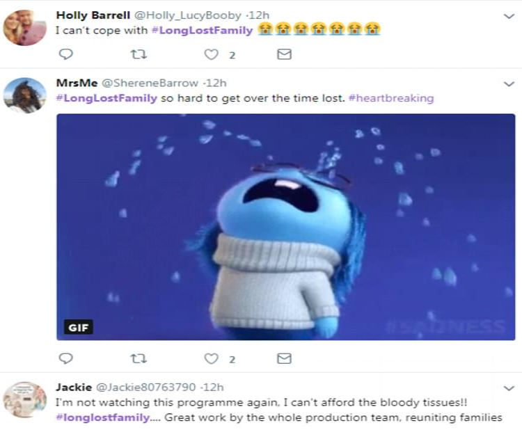 ‘I can’t cope with #LongLostFamily,’ one viewer wrote with multiple crying emojis.