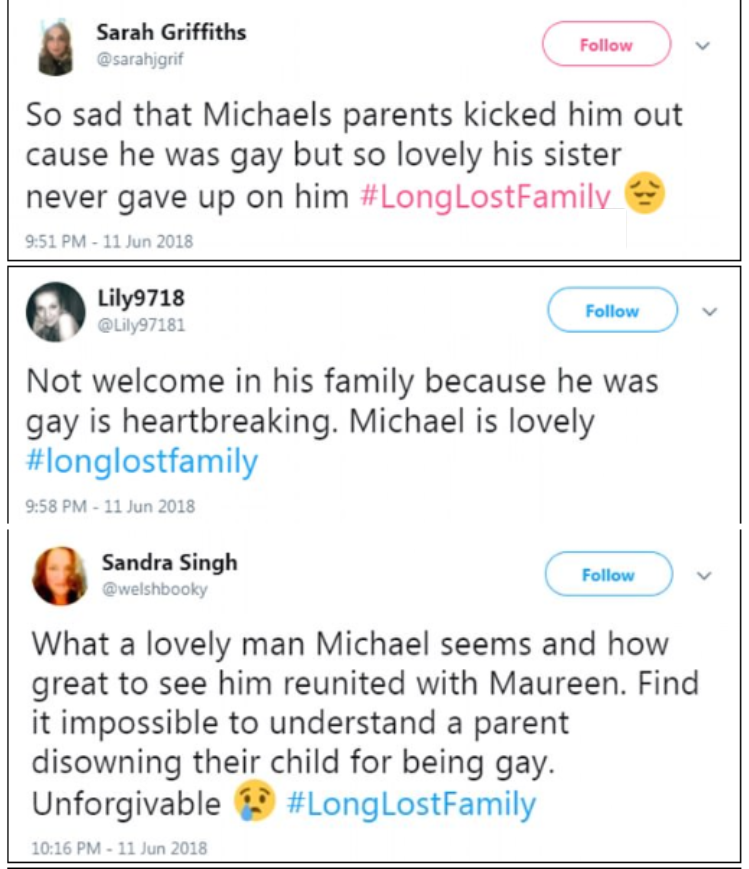 ‘Not welcome in his family because he was gay is heartbreaking. Michael is lovely,’ said another.
