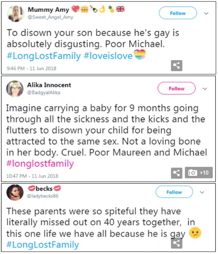 ‘Imagine carrying a baby for 9 months going through all the sickness and the kicks and the flutters to disown your child for being attracted to the same sex. Not a loving bone in her body. Cruel. Poor Maureen and Michael,’ added one.