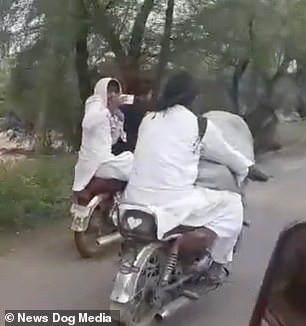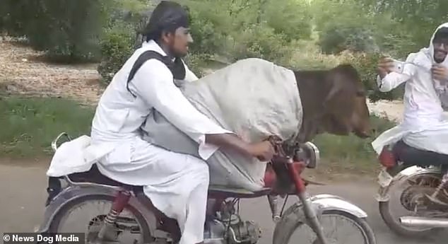 The video, which was filmed by a passing car passenger in rural Pakistan, shows a man riding his bike while a cow covered in grey fabric is sitting on his lap.