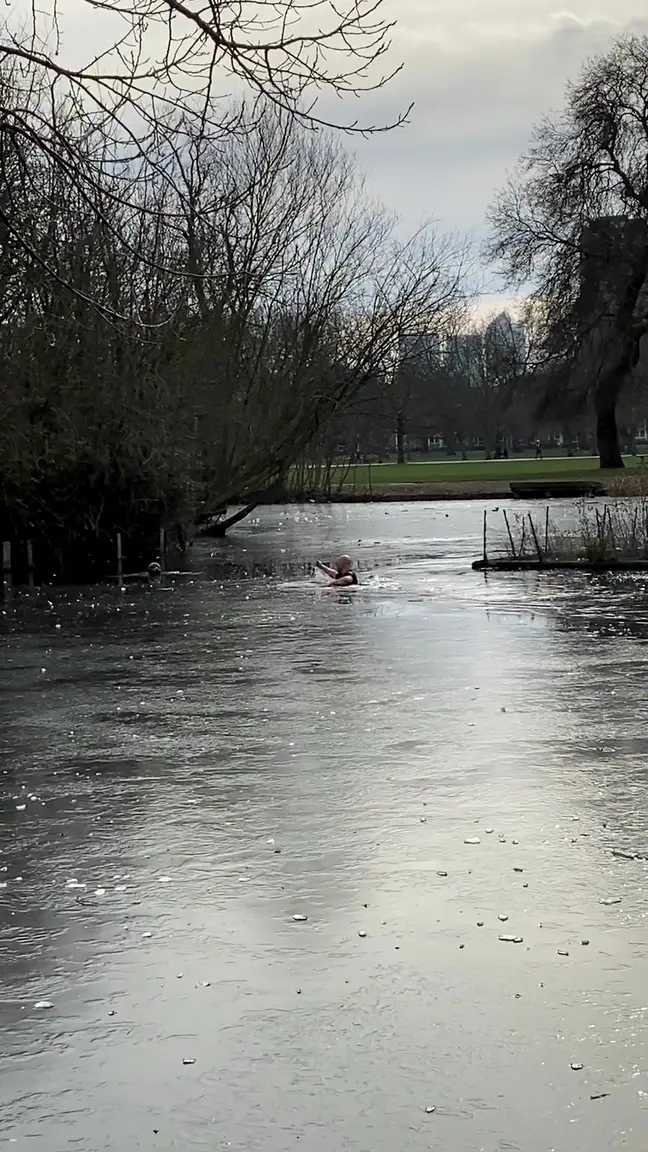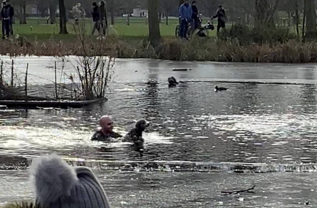 “Half of the water was frozen, half wasn’t and the dog ran over the frozen bit and fell through a bit that wasn’t frozen. People around us said the dog was trying to grab a duck when he fell in.”