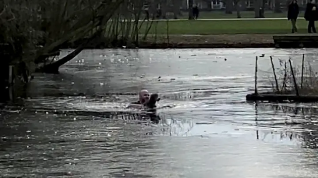 A man is being hailed a hero after he jumped into the icy waters to save a puppy from the frozen pond.