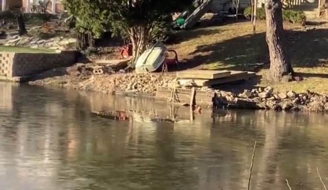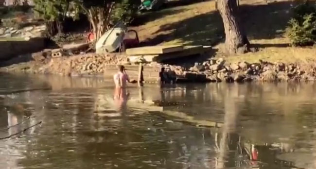 A cat was walking over a freezing, ice-covered Lake George in Hobart, Indiana when it fell in the lake and got trapped inside.