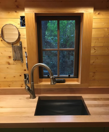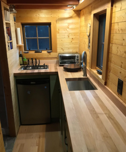 There is ample ventilation for this 150 square feet home. There is a kitchen, counters and a wardrobe that is built in this tiny home.