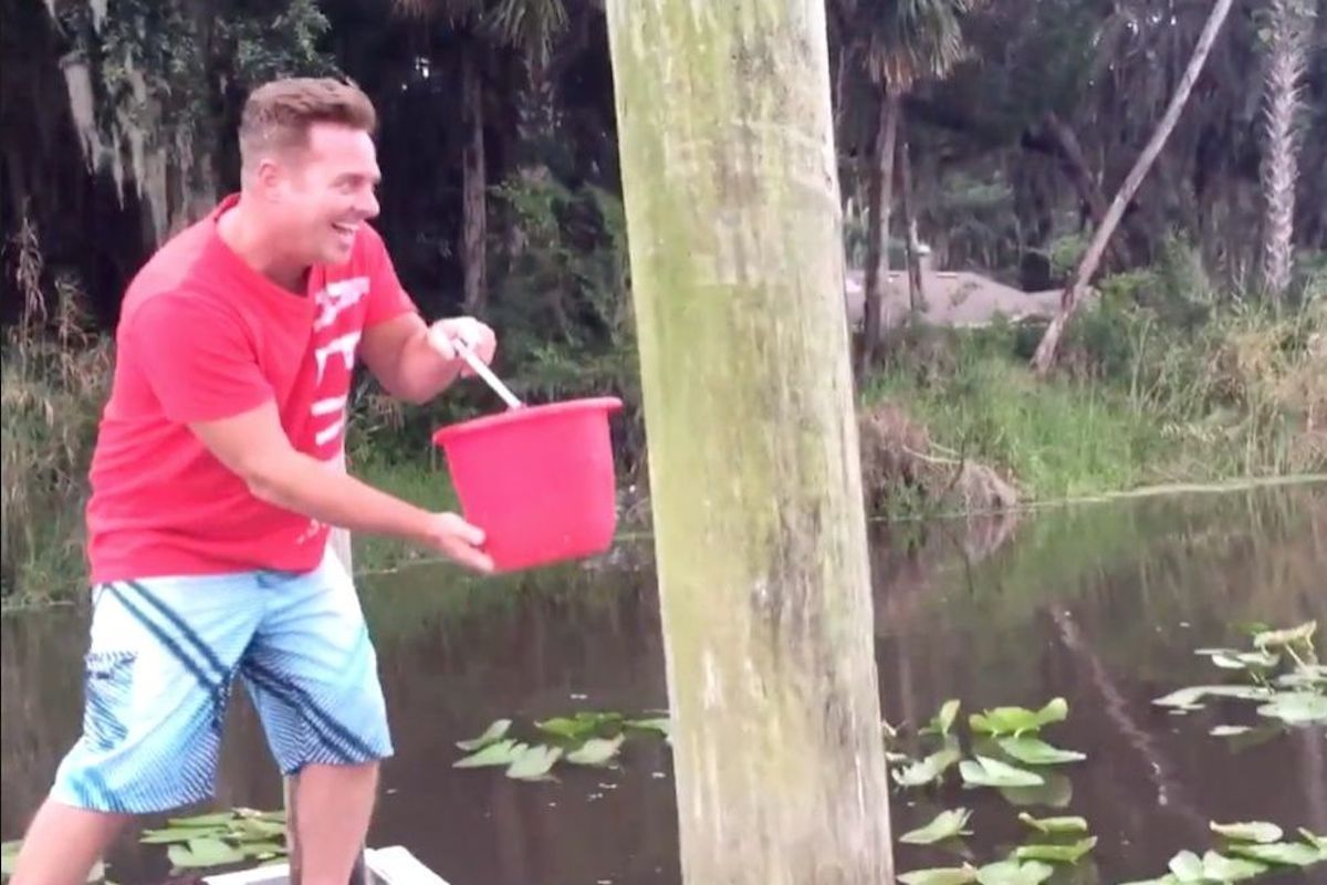 Watch the river exploding after a man throws a bucket of water into it