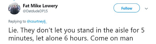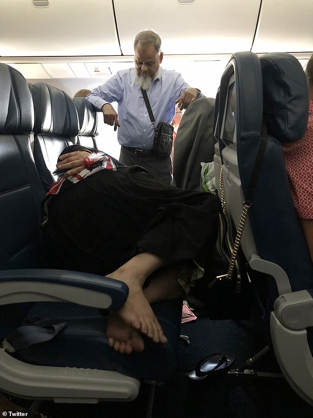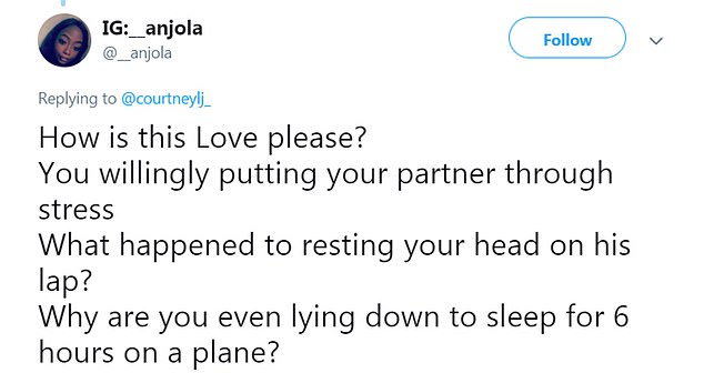 A Twitter user named Courtney Lee Johnson who is a life coach from Indiana shared an image of an unidentified man who had stood in the aisle of the cabin while his wife slept for a full six hours during a long-haul flight.