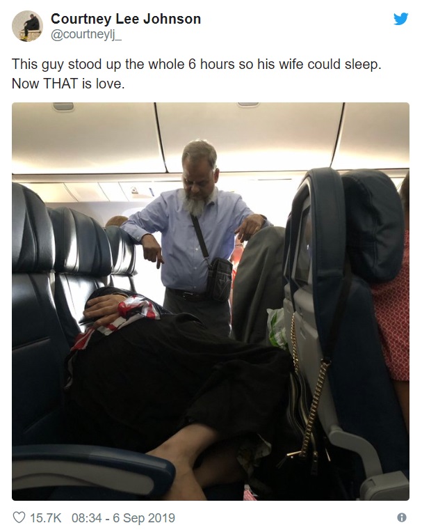 “This guy stood up the whole 6 hours so his wife could sleep. Now THAT is love,” the life coach who shared the image said.