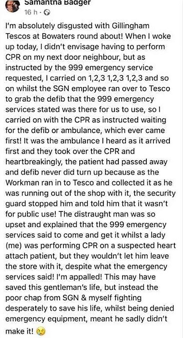 “I’m absolutely disgusted with Gillingham Tescos at Bowaters roundabout! When I woke up today, I didn’t envisage having to perform CPR on my next-door neighbor, but as instructed by the 999 emergency service requested, I carried on whilst the SGN employee ran over to Tesco to grab the defib that the 999 emergency services stated was there for us to use,” Badger wrote in a Facebook post as she called for the store staff to be held accountable.