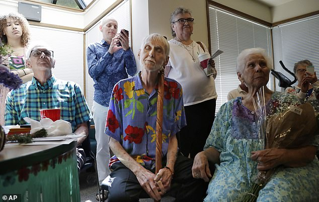 His newly-wed husband gave him support as he walked into the room while a violinist played Ave Maria and Amazing Grace in the background.