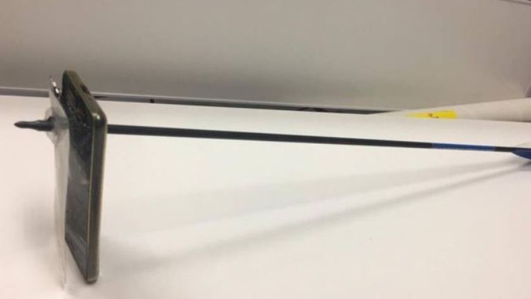 According to police, the arrow pierced the man’s phone and knocked it back into his face. Because his device already received and stopped the impact, he only suffered a small cut.