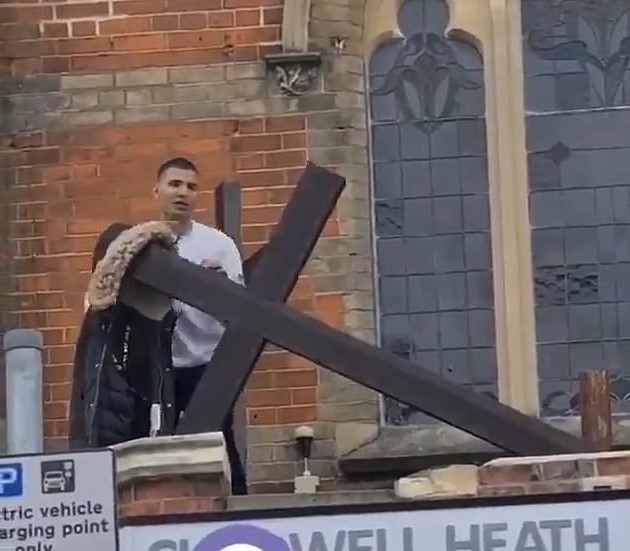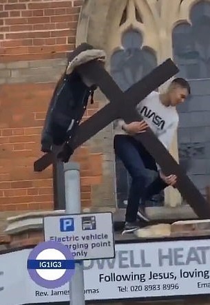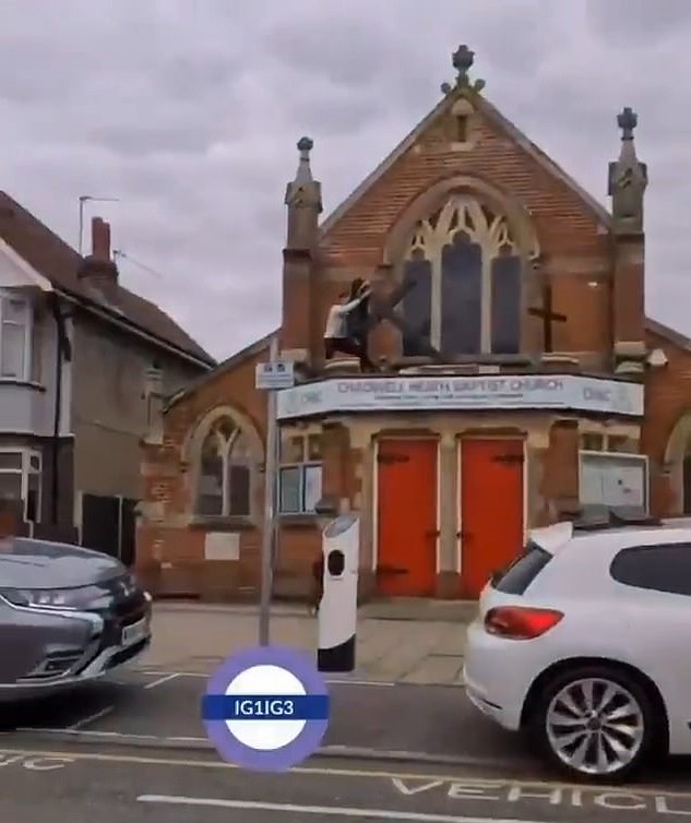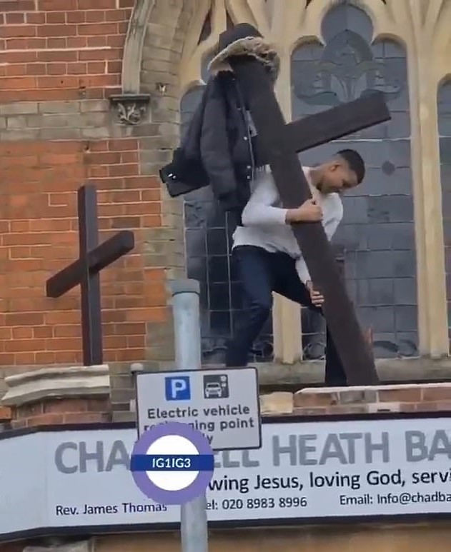 With his coat placed on top of the wooden cross, the man repeatedly tried to pull it from the roof of Chadwell Health Baptist Church.