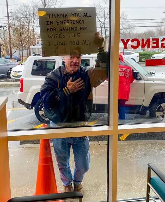 The tear-jerking photo was taken by nurse Allison Swendsen at the Morristown Medical Center ER in New Jersey where the senior man thanked the staff using a homemade sign that read: