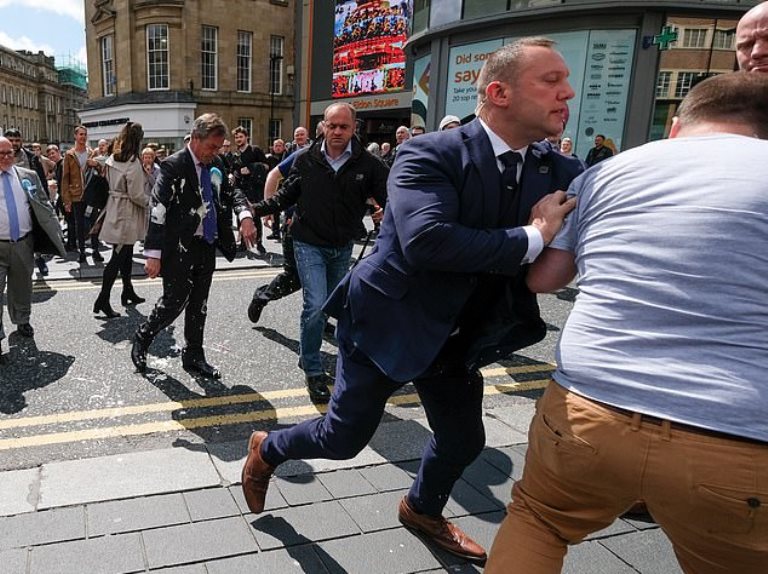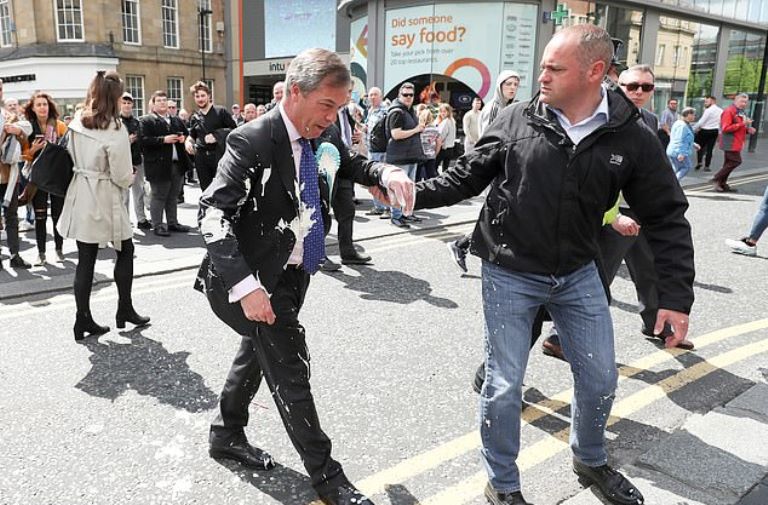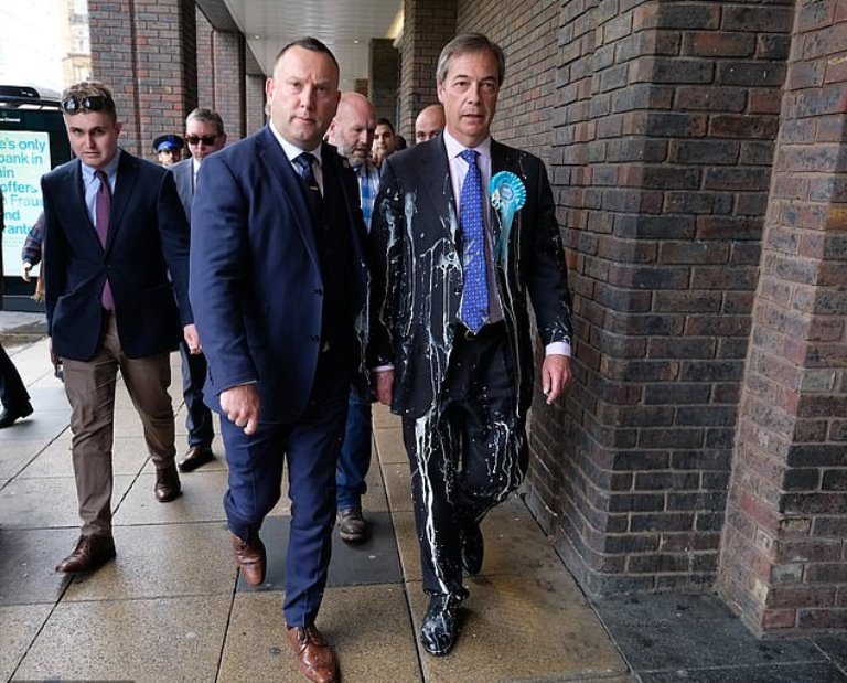 The Brexit Party leader’s attire was left pelted in milkshake after the incident and he was immediately taken away from the scene.