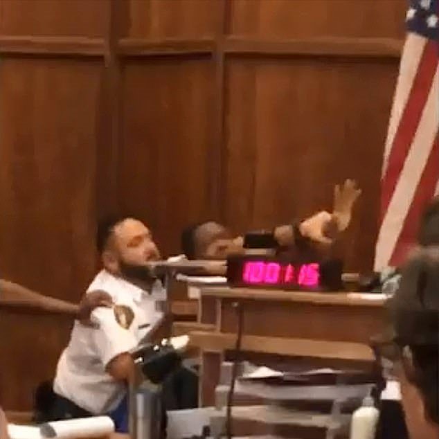 In pictures shared by the witnesses, the 33-year-old can be seen attempting to wipe his poo-stained hands on the judge’s table while an officer is holding onto his hand.