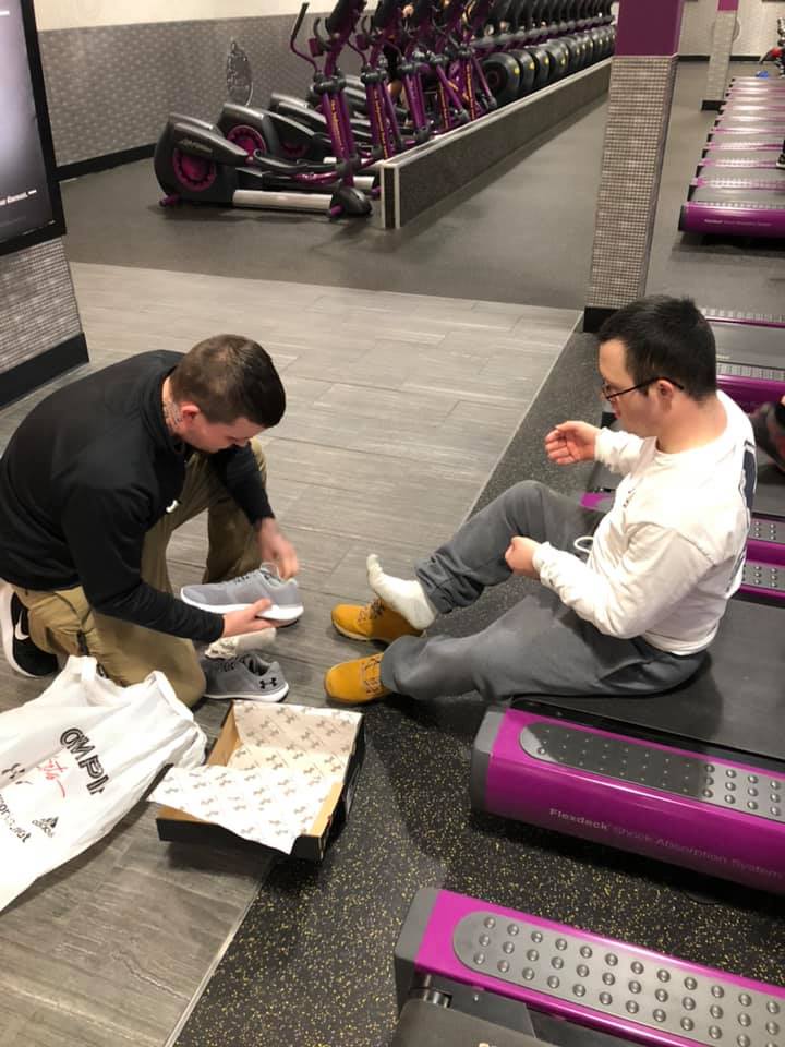 Daniel Cote, the manager of the Planet Fitness in Woonsocket, Rhode Island, bought Christopher a pair of athletic shoes and even put them on his feet.